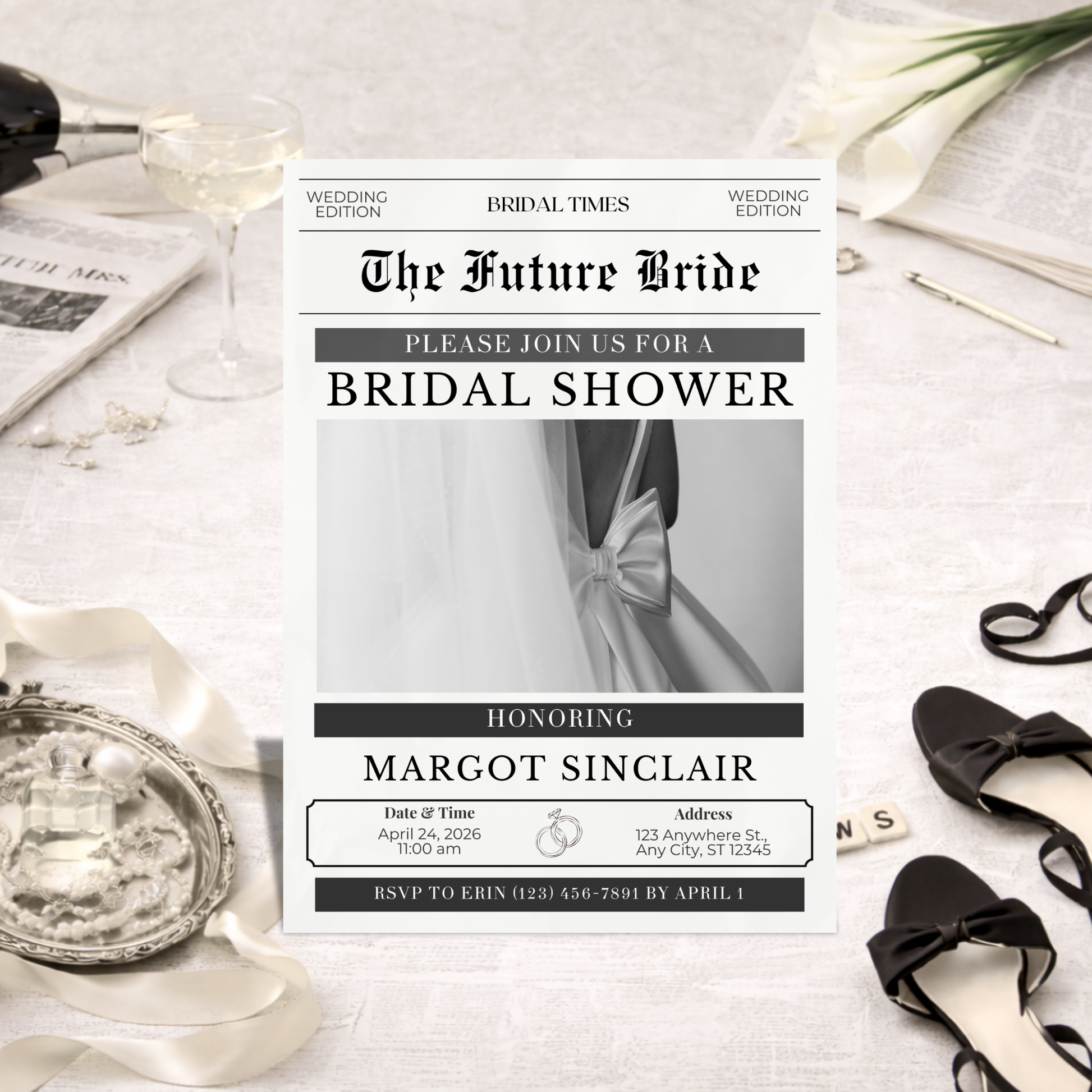 Editorial Bridal Shower Invitation | Newspaper Style | Editable Canva Template