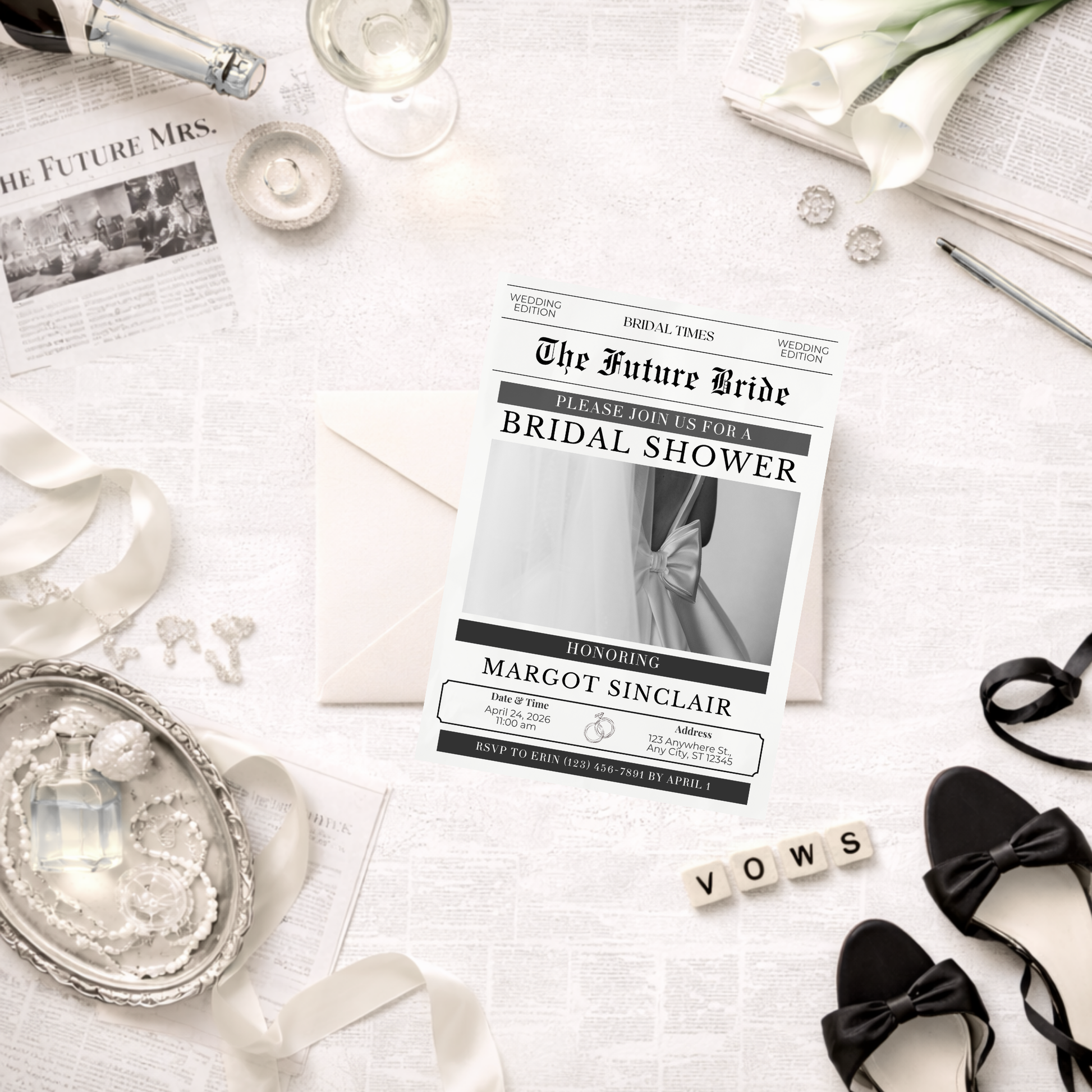 Celebrate the bride-to-be with a refined, fashion-forward invitation inspired by classic newspaper layouts and modern editorial bridal style. This black-and-white editorial bridal shower invitation features bold typography and intentional white space — perfect for elevated, city-chic pre-wedding celebrations.