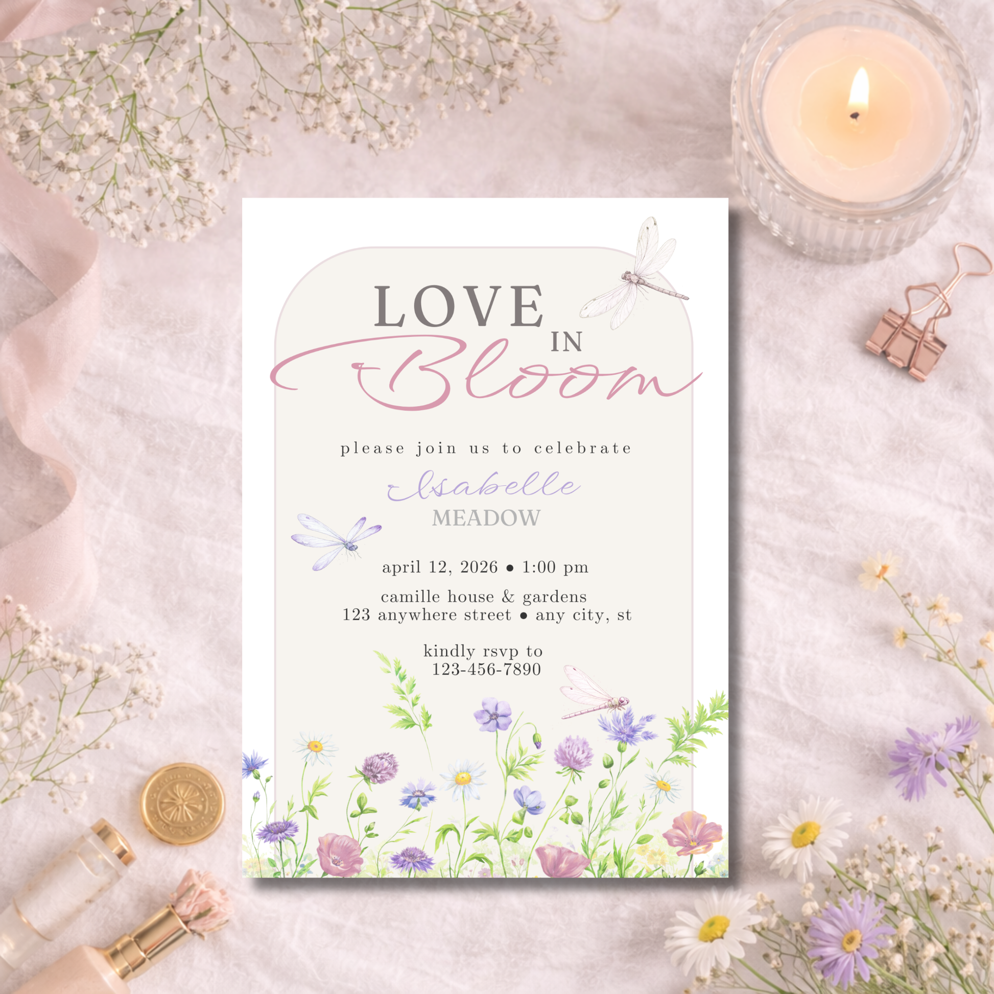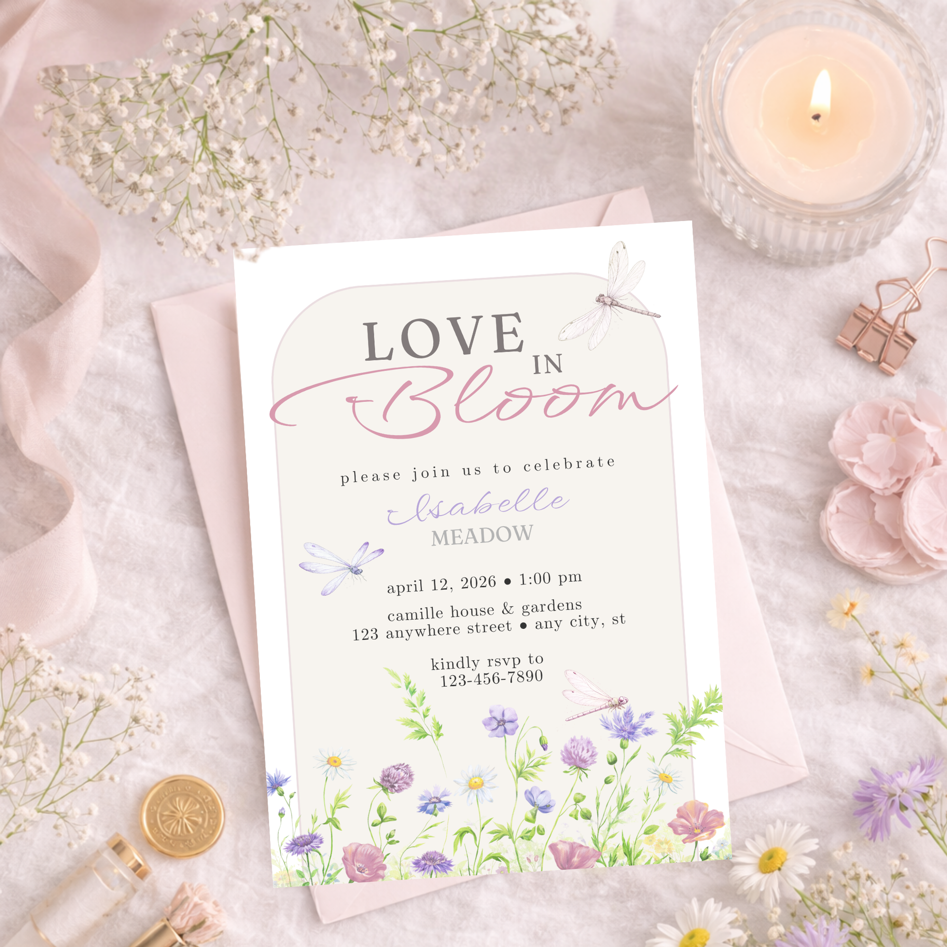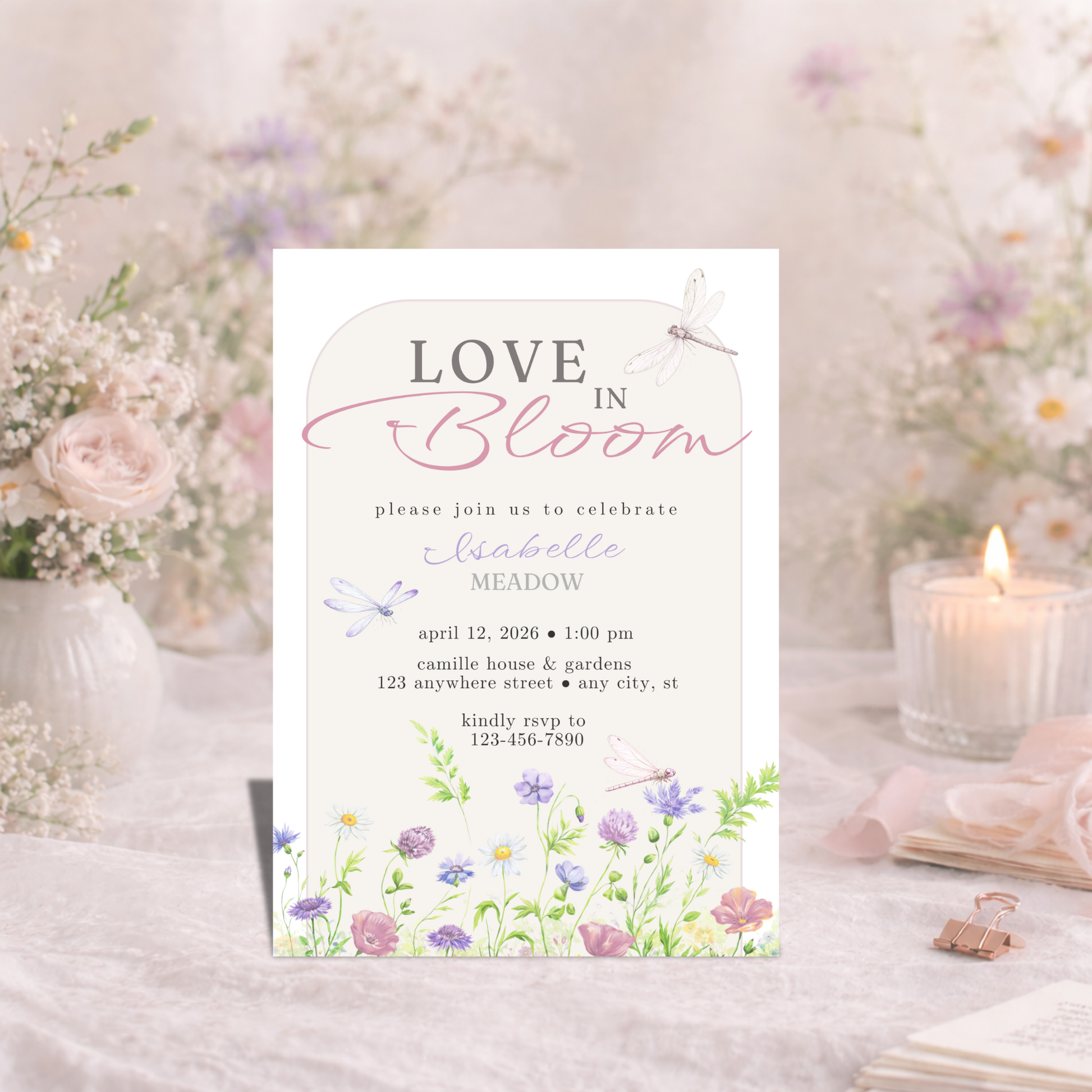 Celebrate love with a soft, romantic garden aesthetic. The Love in Bloom Bridal Shower Invitation features delicate wildflowers, graceful dragonflies, and airy spring tones — perfect for hosting an elegant bridal shower or floral-inspired celebration.