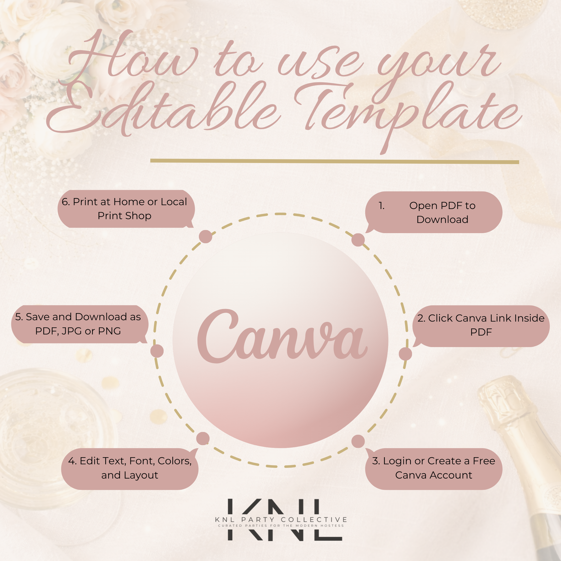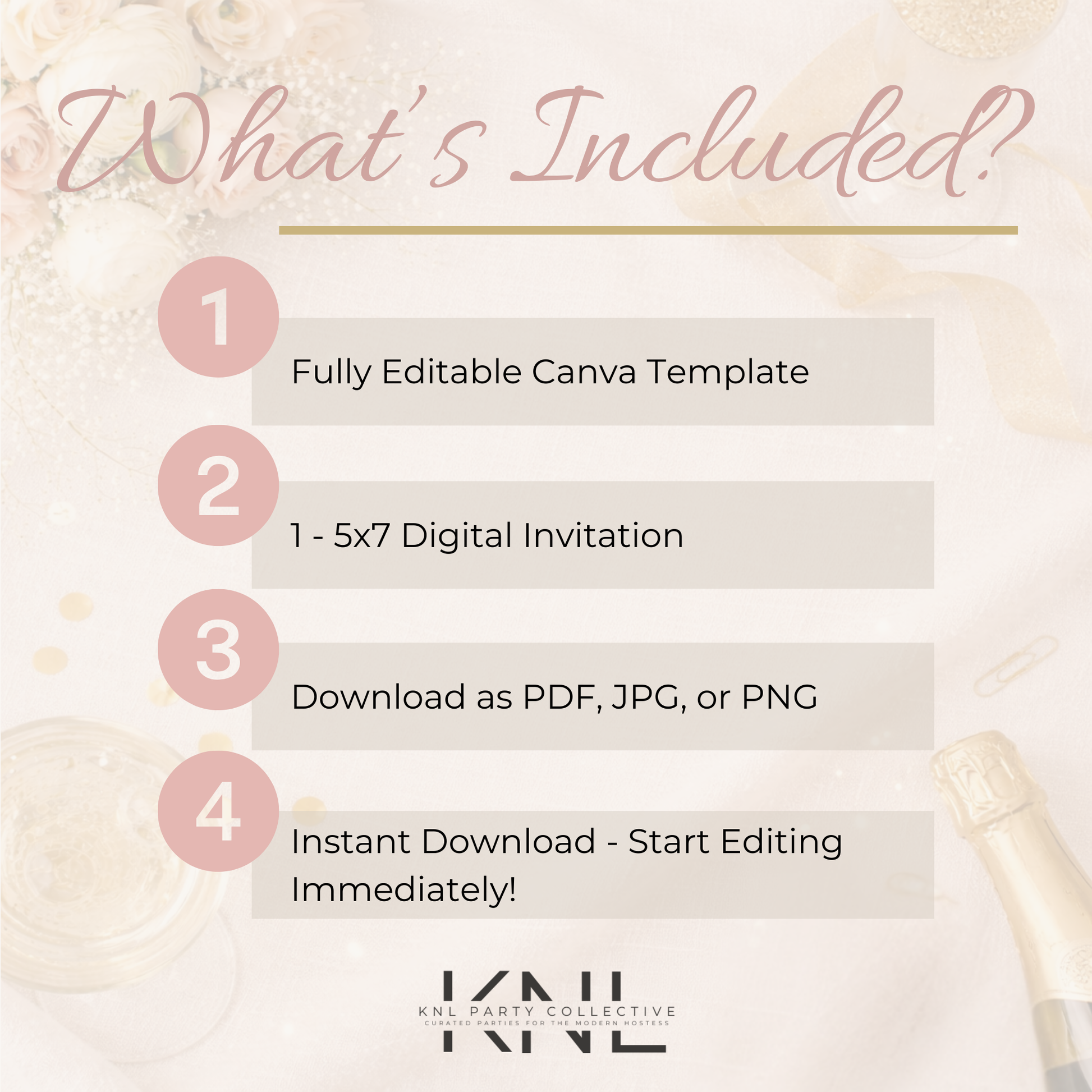 Designed with soft blush tones, warm champagne gold accents, and modern romantic typography, this invitation sets the tone for an elevated, effortless celebration — classic, elegant, and endlessly reusable.